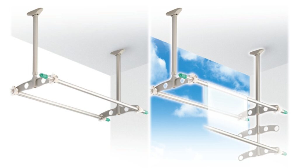 生活空間との融合を追求したデザイン、簡単な施工で取り付けることができる室内物干し 生活空間との一体感を重視したデザイン。 天井に取付けて、必要な時に竿を引き下ろ…