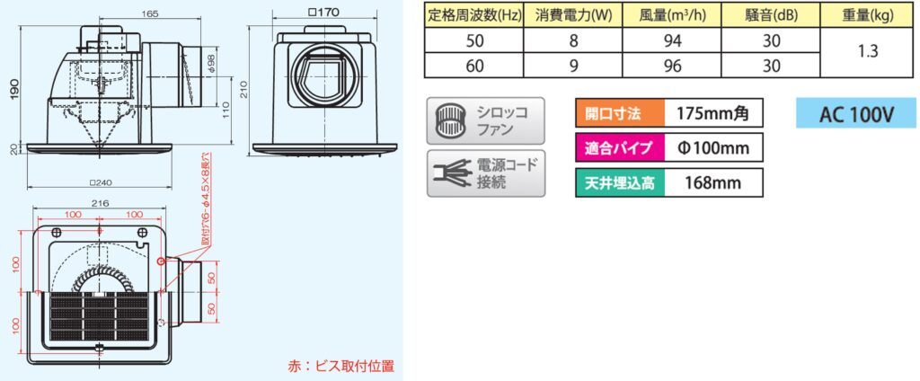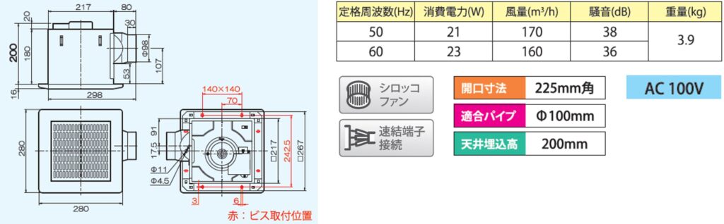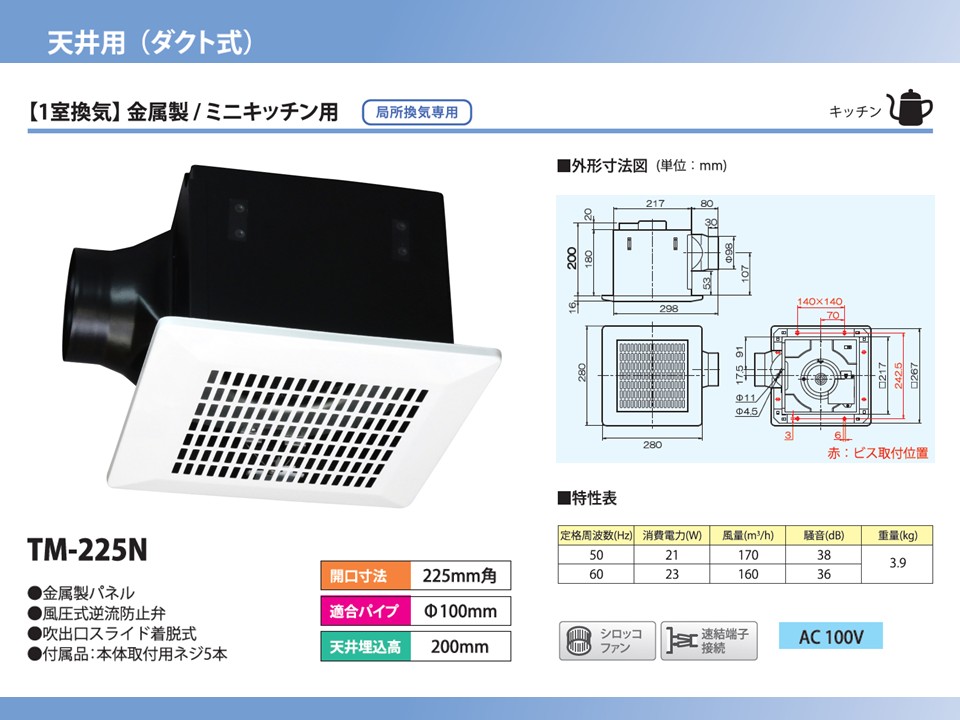 | TM-225N | 天井用換気扇 ミニキッチン用 格子パネルタイプ オール金属製 | ●金属製 ●AC100V ●本体重量:約4.6kg ●シロッコファン ●速結端子接続 | ・開口寸法(mm):225×225 ・適合パイプ(mm):φ100 ・風量(m3/h): 170/160 (50/60Hz) ・消費電力(W): 21/23 (50/60Hz) | 19,800円 (税抜) |