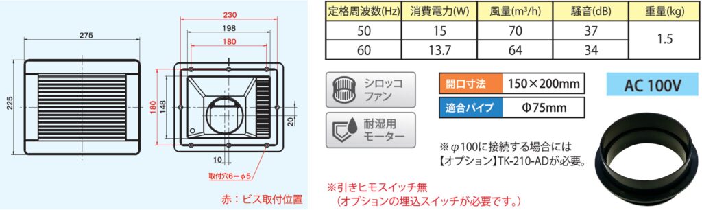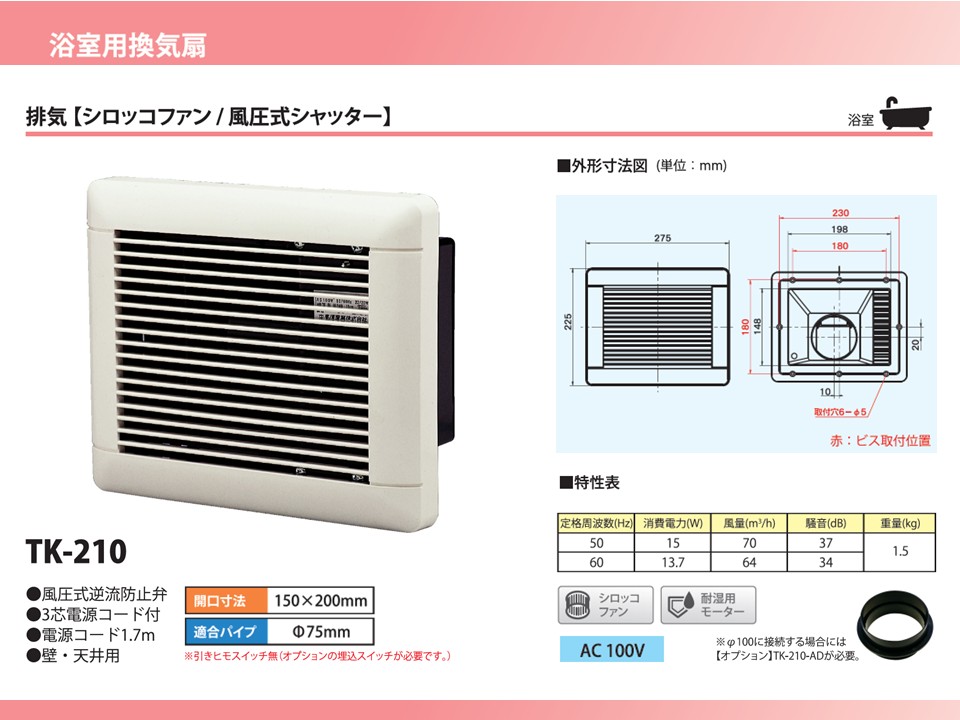 | TK-210 (壁・天井用) | 浴室用換気扇 シロッコファン 排気 RGAZ 001B同等機種 | ●AC100V ●適合パイプ:φ75mm ●本体重量:約1.5kg ●電源コード1.7m ※φ100に接続する場合には 別売品TK-210-ADが必要。 | ・開口寸法(mm):150×200 ・ファン:シロッコファン ・風量(m3/h): 70/64 (50/60Hz) ・消費電力(W): 15/13.7 (50/60Hz) | 10,500円 (税抜) |