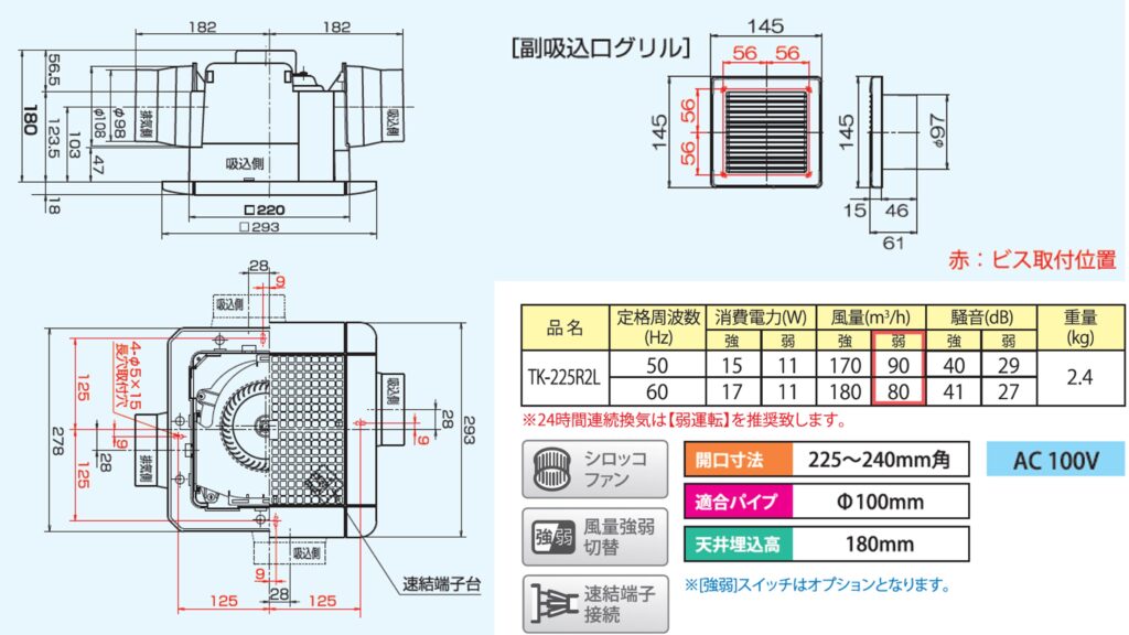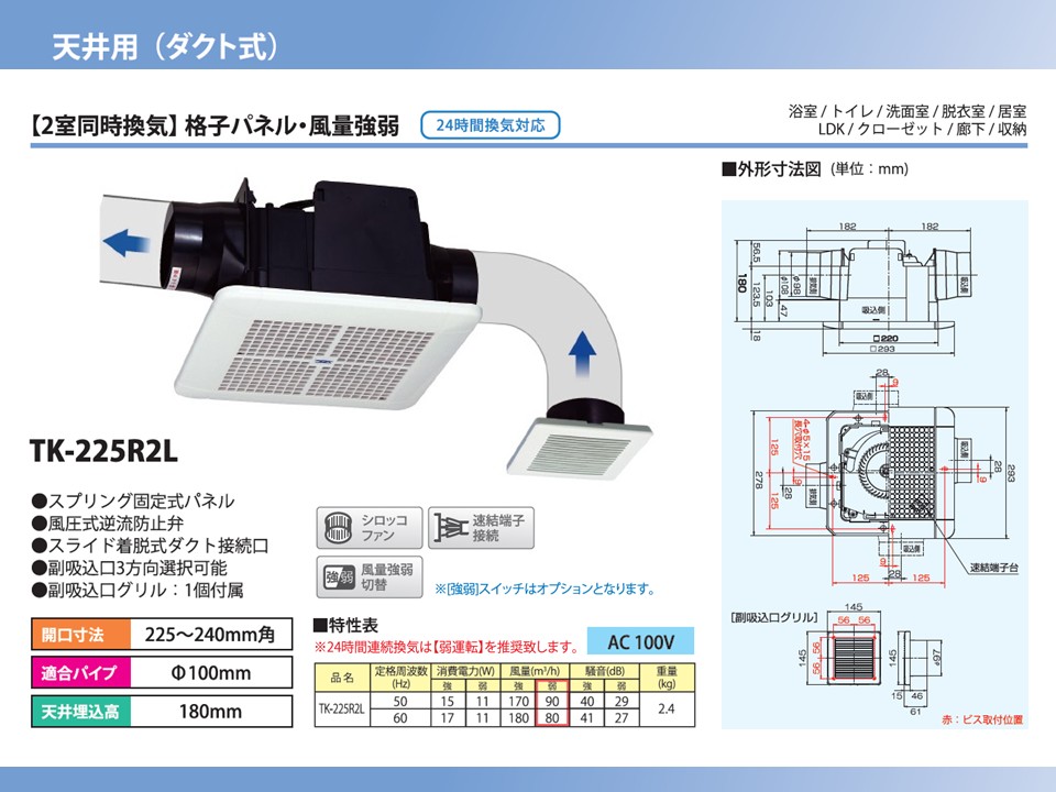 | TK-225R2L | 天井用換気扇 標準タイプ 24時間換気対応 格子パネル (2室同時換気) | ●副吸込口グリル 1個付属 (TSK-100MGW) ●風量強弱 ●AC100V ●本体重量:約2.4kg ●シロッコファン ●速結端子接続 | ・開口寸法(mm): 225×225~240×240まで対応 ・適合パイプ(mm):φ100 ・風量(m3/h): 170/180・90/80 強(50/60Hz)・弱(50/60Hz) ・消費電力(W): 15/17・11/11 強(50/60Hz)・弱(50/60Hz) | 22,000円 (税抜) |