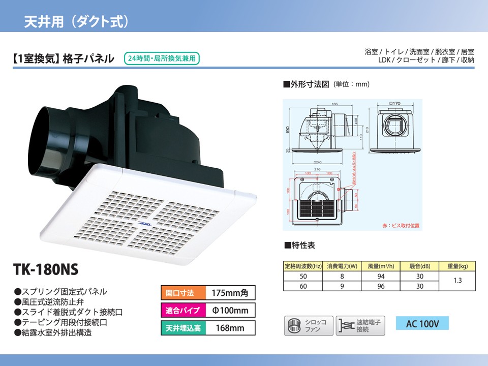 | TK-180NS | 天井用換気扇 格子パネルタイプ 天井埋込高さ168mm TK-100VN後継機種 | ●AC100V ●本体重量:約1.3kg ●シロッコファン ●速結端子接続 | ・開口寸法(mm):175×175 ・適合パイプ(mm):φ100 ・風量(m3/h): 94/96 (50/60Hz) ・消費電力(W): 8/9 (50/60Hz) | 11,500円 (税抜) |