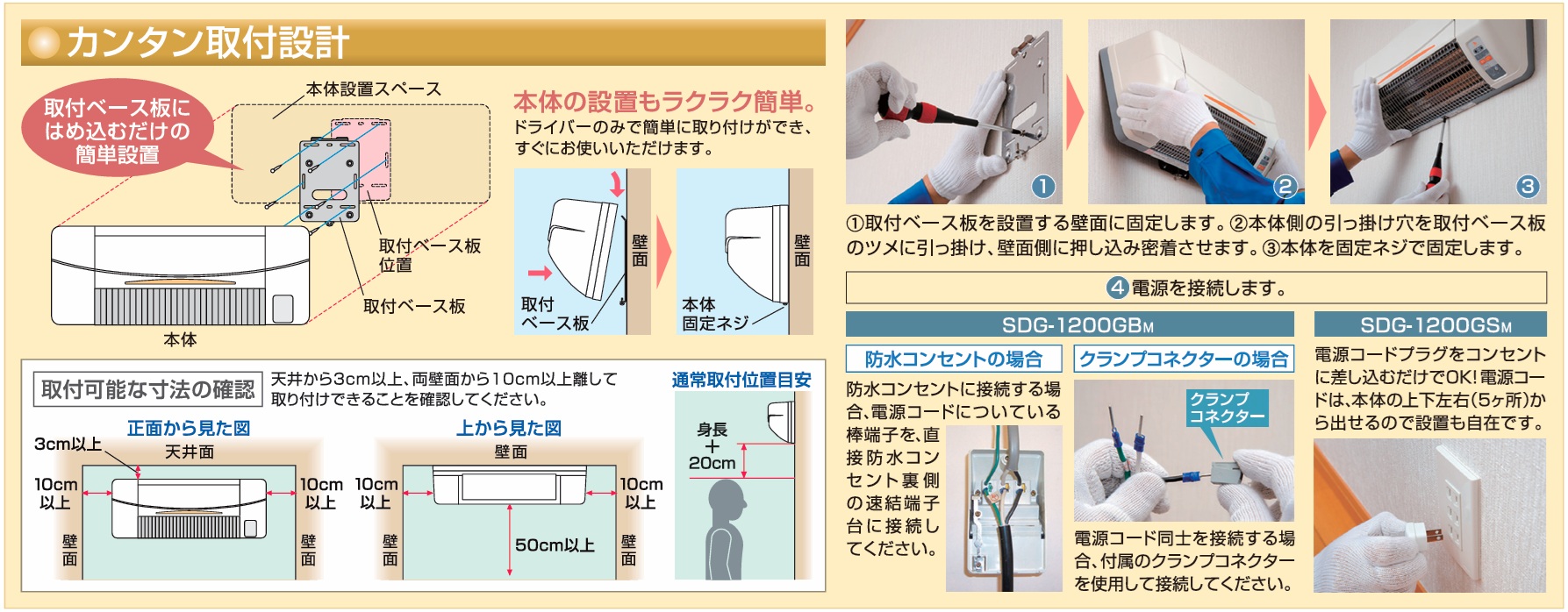| 涼風暖房機 浴室用 防水仕様 | SDG-1200GBM | ●SDG-1200GB後継機種 ●エリアスポット暖房&涼風 ●いろいろな場所に設置 できるコンパクト設計 ●人感センサーと タイマー運転機能で 安心ECOライフ ●お手入れラクラクフィルター ●ダブルシロッコ 両軸クロスファン方式 | ●搭載ヒーター: 遠赤外線グラファイト ヒーター (600W×2本/1200W) ●電源仕様: AC100V/電源コード/ 棒端子接続タイプ1.2m ●リモコン: 品番 SD-GMC 防水ワイヤレス ミニリモコン(IPX7) ●本体重量:約3.7kg | 100,000円 |