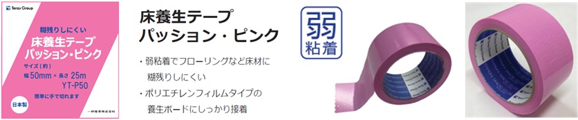 | 床養生テープ | YT-P50 | パッション・ピンク | 6.40 | 2.56 | 0.110 | 50mm x 25m | 30巻 |