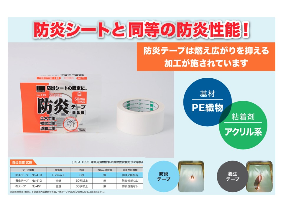 | 防炎テープ | No.419 | 白 | 8.00 | 3.20 | 0.170 | 50mm x 25m 75mmx25m 100mmx25m | 30巻 24巻 18巻 |