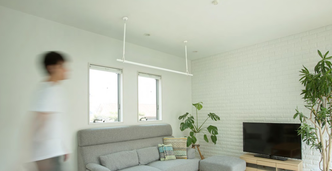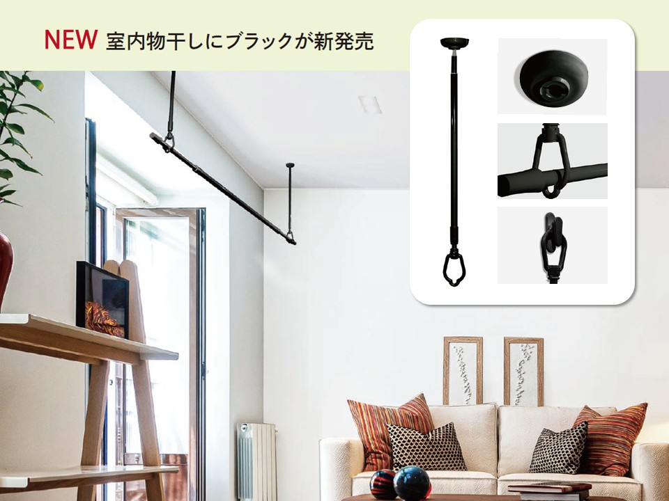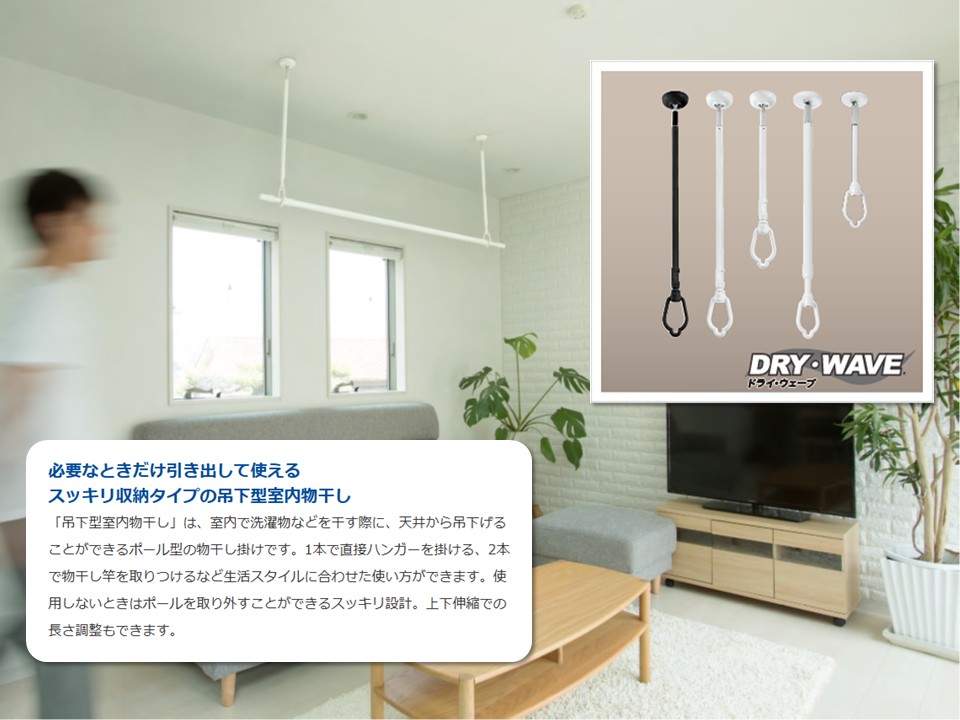 「吊下型室内物干し」は、室内で洗濯物などを干す際に、天井から吊下げることができるポール型の物干し掛けです。