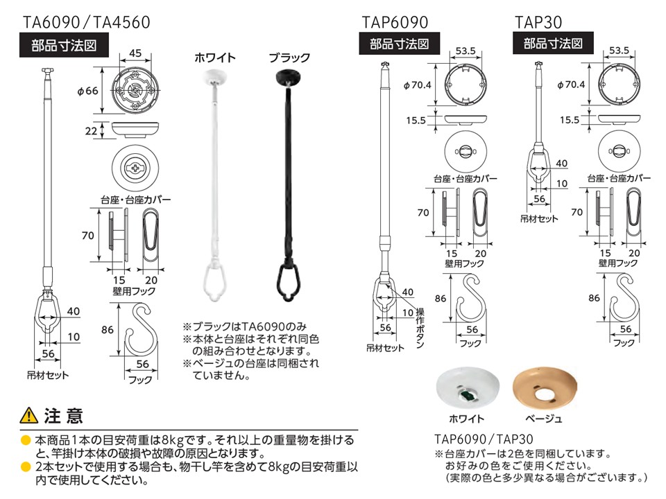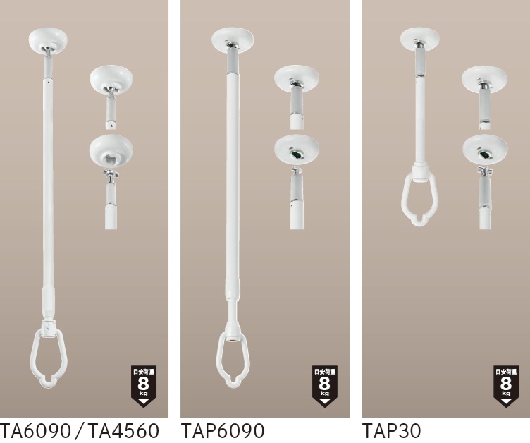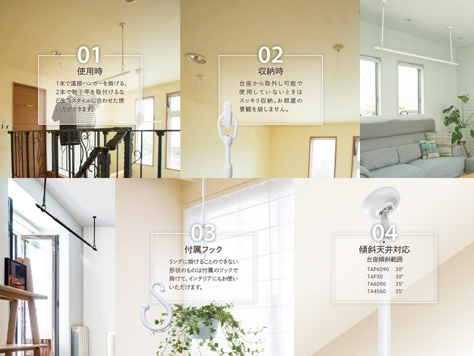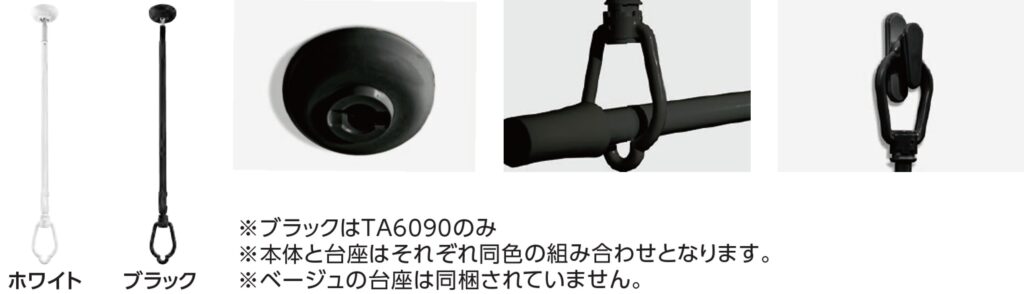 | 吊下型室内物干 | フレキシブル (フリー固定) | TA6090 | φ66×600mm | ホワイト ※台座:ホワイト ブラック ※台座:ブラック | 約8kg | 1本入 |