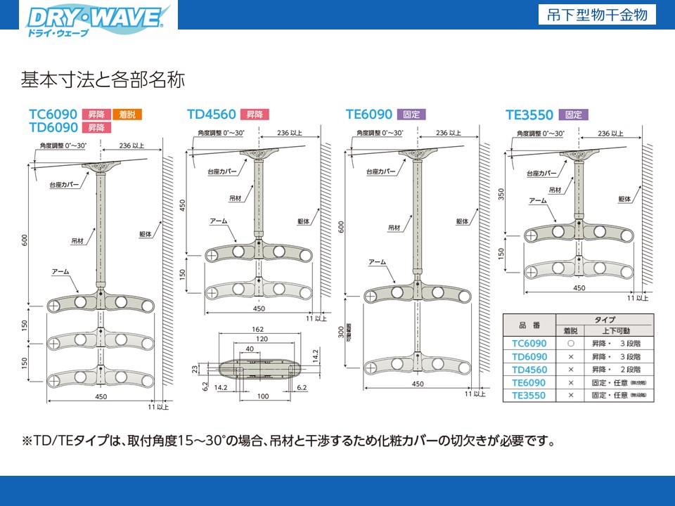 ※TD/TEタイプは、取付角度15~30°の場合、吊材と干渉するため化粧カバーの切欠きが必要です。