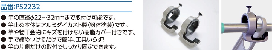 | 落下防止用 竿止め | PS2232 | ※PS使用時は 併用を推奨 | 竿/直径φ22~32mmまで対応 | ステンカラー | 1個入 | ¥1,600 |