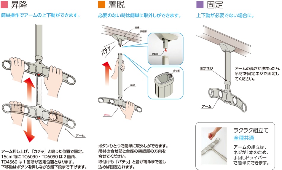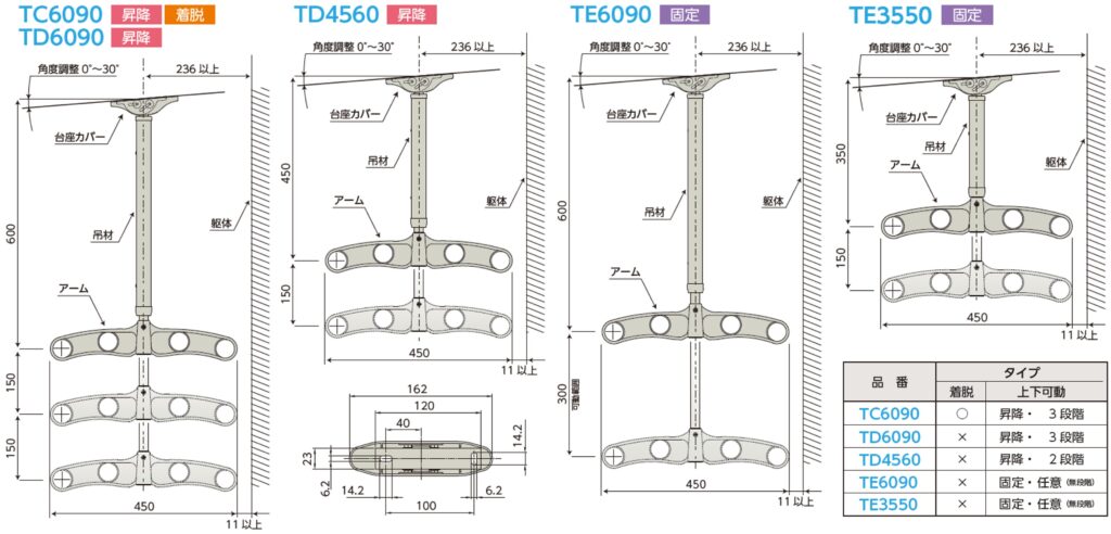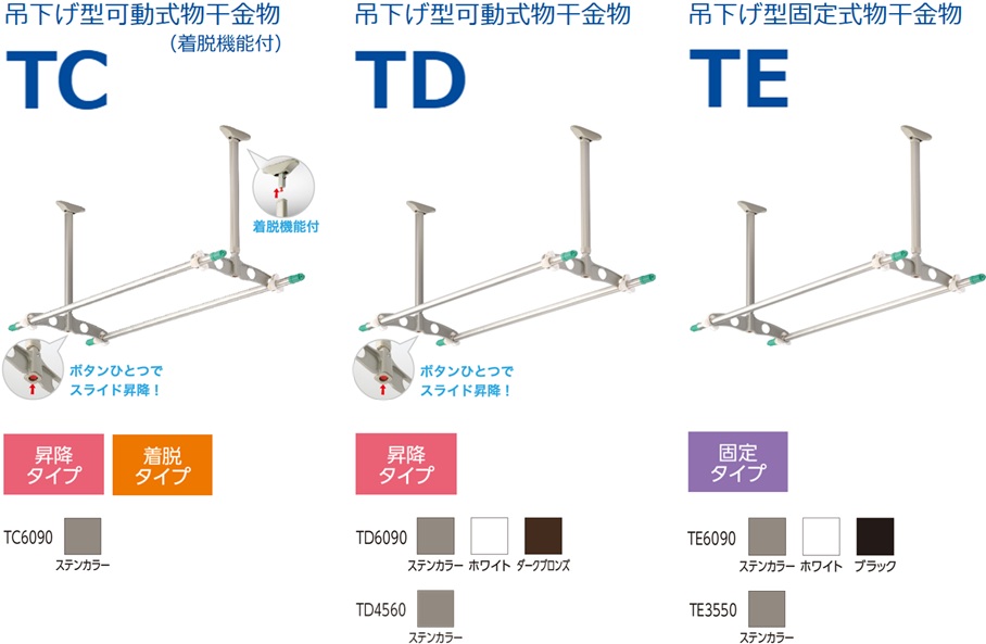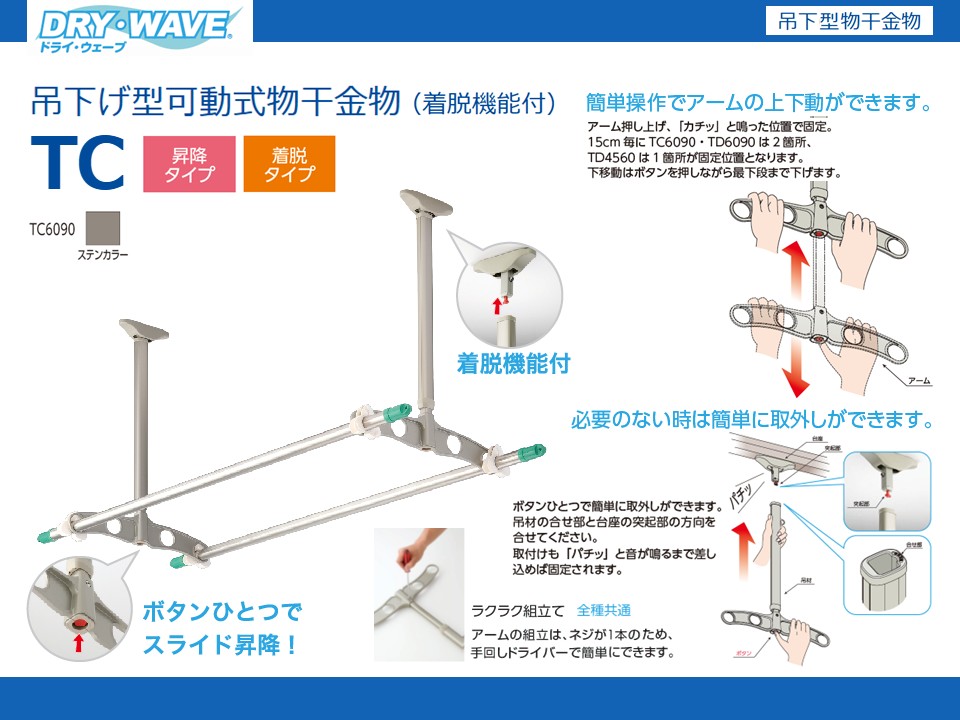 | 吊下型物干金物 | 可動式(昇降・着脱) | TC6090 | W450xD39xH628mm | ステンカラー | 2本入 | 約20kg |