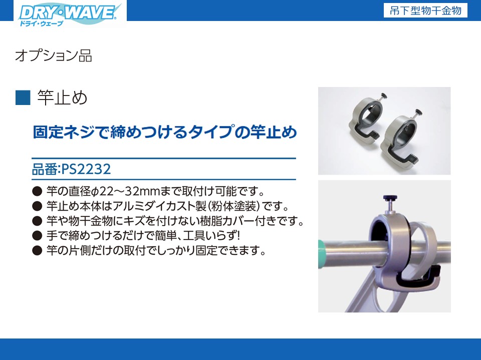 | 落下防止用 竿止め | PS2232 | ※PS使用時は 併用を推奨 | 竿/直径φ22~32mmまで対応 | ステンカラー | 1個入 | ¥1,600 |