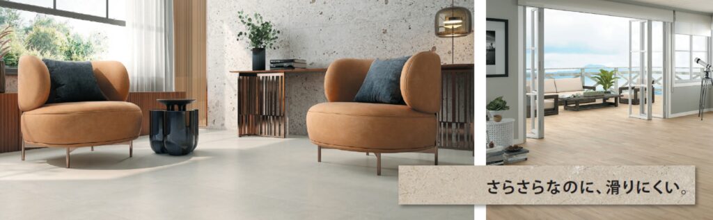 「さらっとグリップ」機能を備えたタイルは、従来のアンチスリップタイルとは違い、表面がさらっと滑らかなのが特長です。