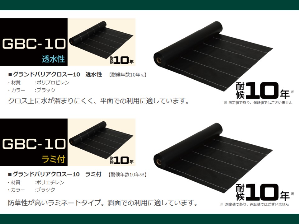 | グランドバリアクロス-10 透水性 GBC-10 透水性 | ブラック | PP | 10年 | 0.4 | 巾1mx50m巻 巾2mx50m巻 巾3mx50m巻 |