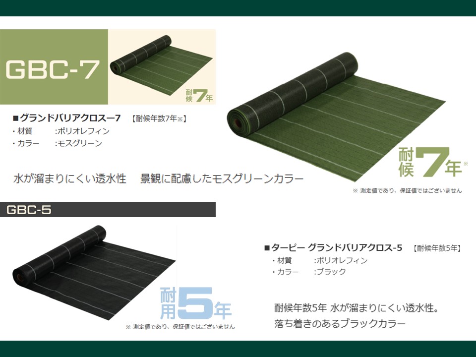 | グランドバリアクロス-5 GBC-5 | ブラック | PP | 5年 | 0.5 | 巾1mx50m巻 巾2mx50m巻 巾3mx50m巻 |