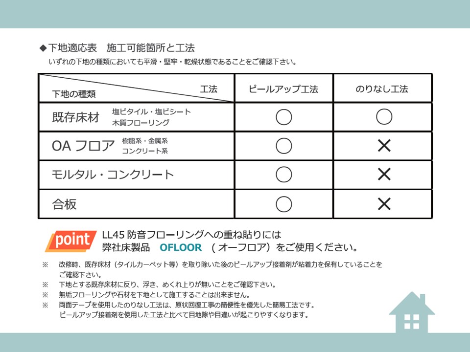 賃貸住宅にも使用でき、接着剤を使用するピールアップ工法にも対応していますので、傷んだ部分1枚だけ交換も可能です。