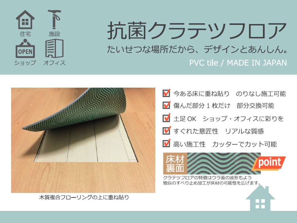 抗菌クラテツフロアは、今あるフローリングの上に置くだけの簡単・置き敷きフロアタイル。