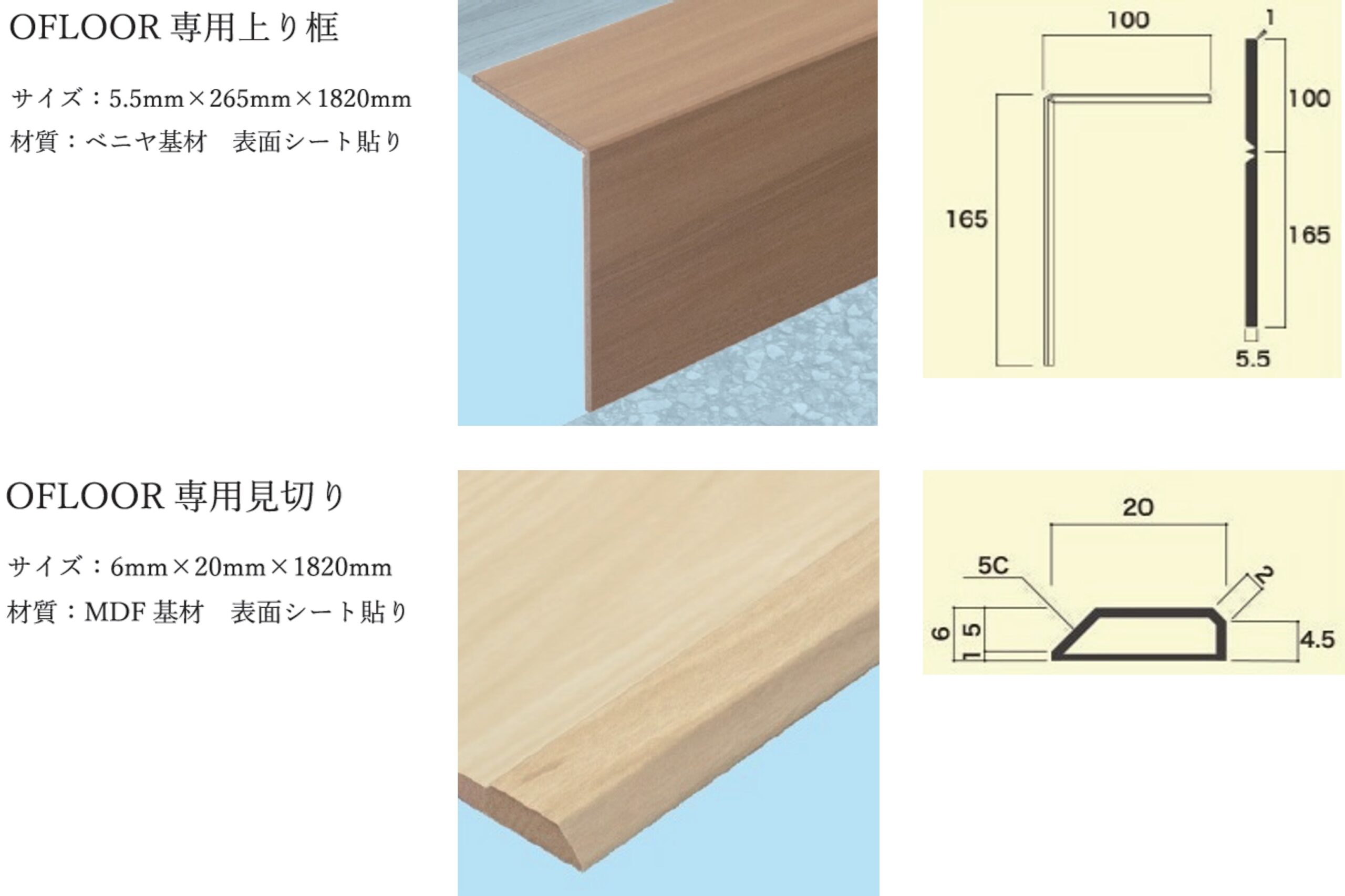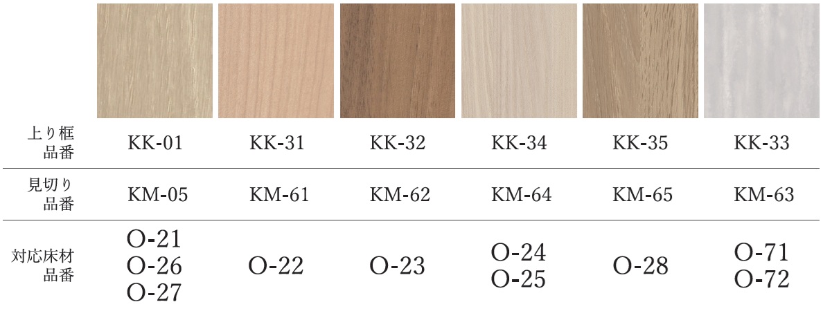 | OFLOOR専用 上り框 | KK-01 KK-31 KK-32 KK-33 KK-34 KK-35 | O-21・26・27 O-22 O-23 O-71・72 O-24・25 O-28 | 5.5x265x1,820mm べニア基材/表面シート貼り | 1本~ | 2本入/梱包 |