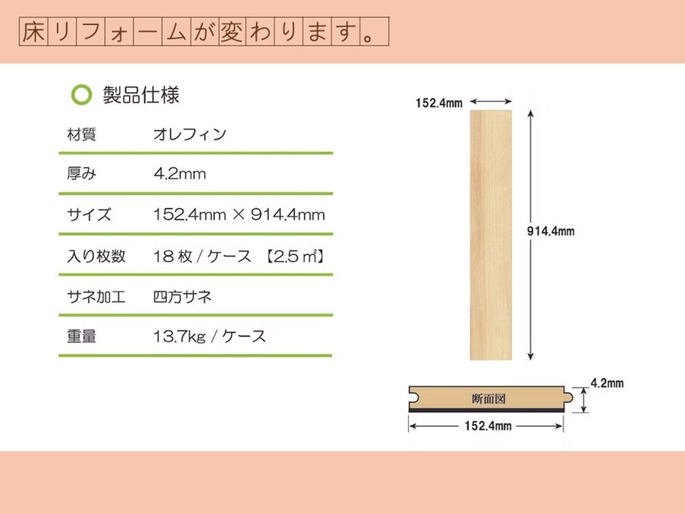 | O-27 マロンベージュ | 見切り KM-05 上り框 KK-01 | 厚4.2mm 152.4x914.4mm | 18枚入/ケース (2.5㎡分) | |