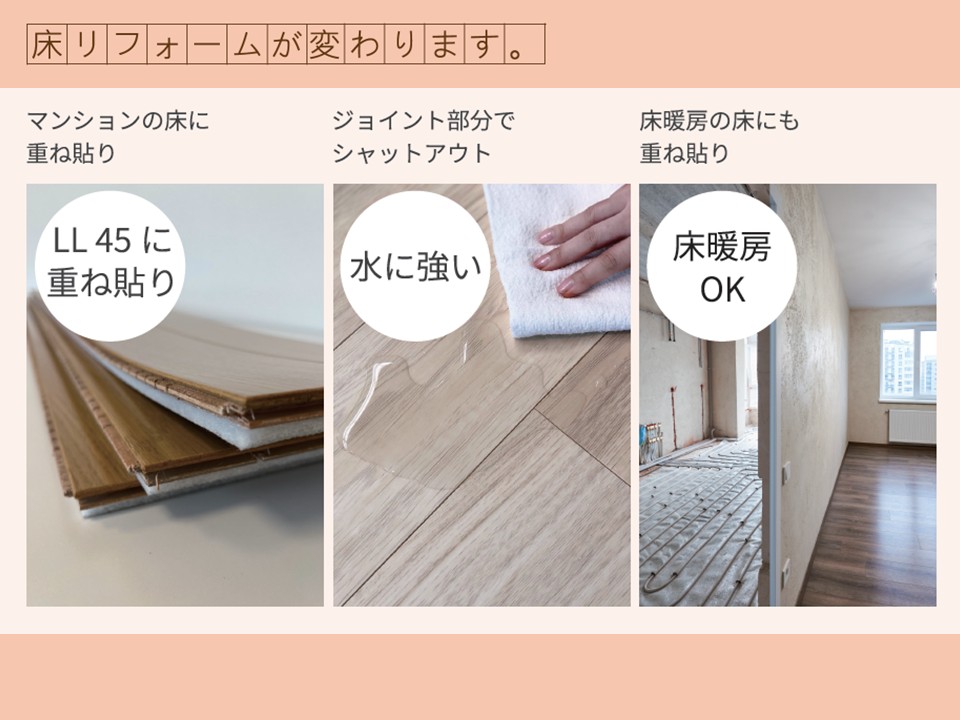 マンションのふわふわする床(LL45直貼り防音フロア)の上に重ね貼りリフォームが可能です。