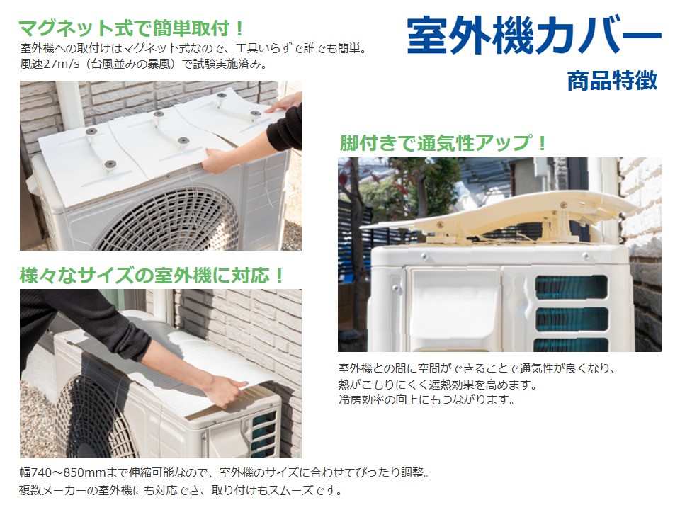 「室外機カバー SLK85」は、マグネットで簡単に取付けることができ、通気性と遮熱効果を高め、
